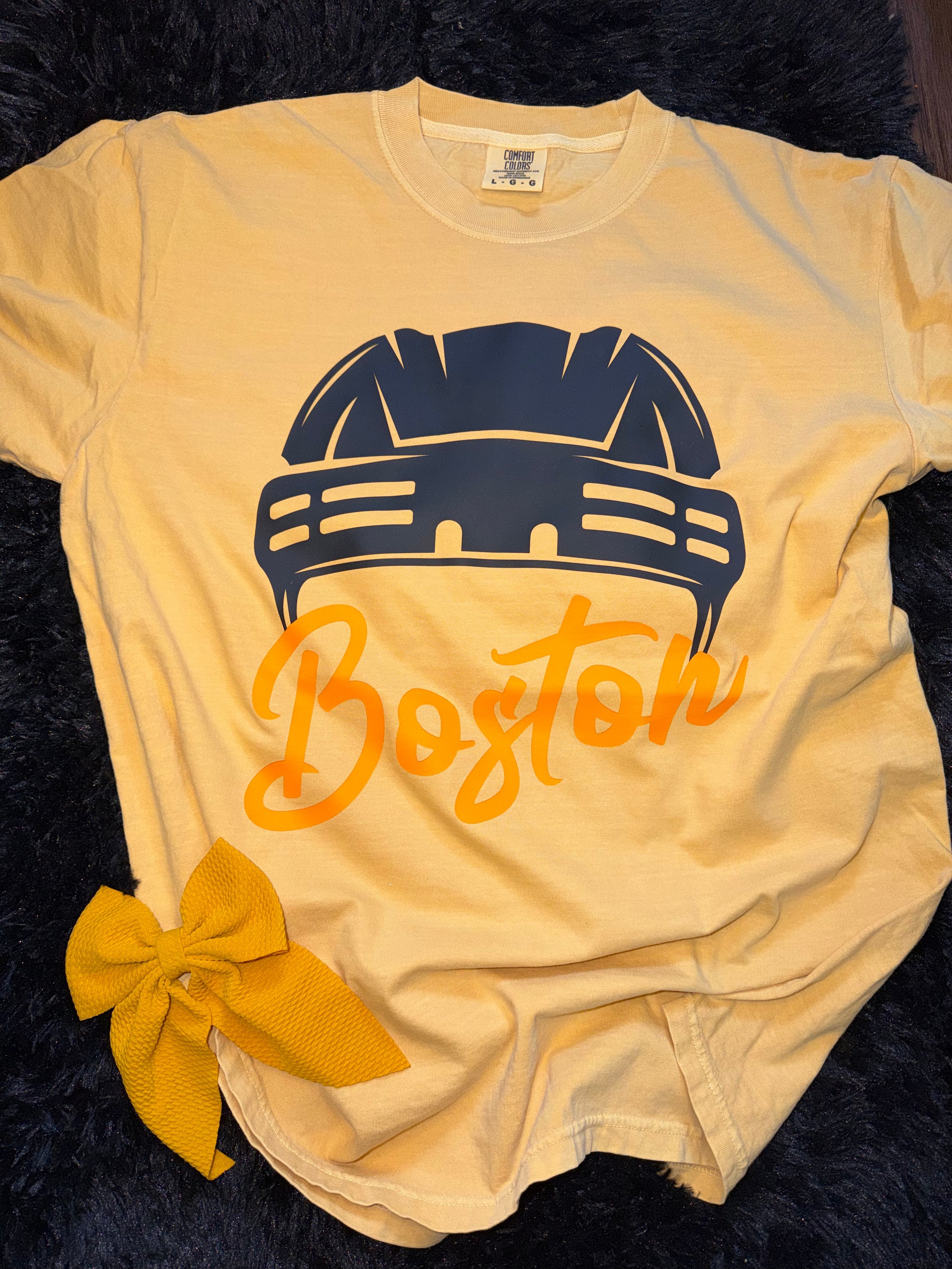 Score big with this Boston hockey helmet tee! Perfect for die-hard fans and casual supporters alike, this playful shirt celebrates the grit and glory of the game. Featuring bold hockey helmet graphics that capture the spirit of Boston's legendary hockey culture, it's ideal for game days, casual outings, or showing your team pride year-round. Comfortable, eye-catching, and ready to turn heads—because every fan deserves to wear their passion!