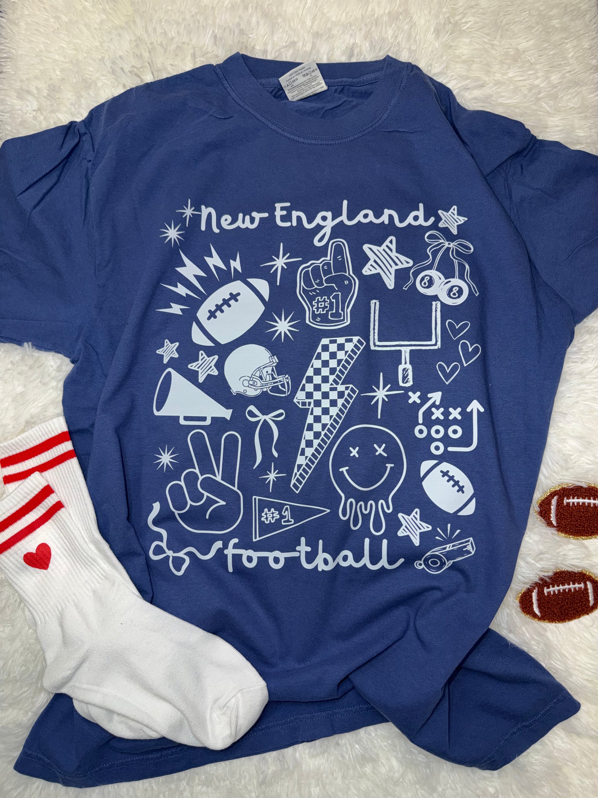 Score big with this New England football graphic tee that celebrates your team pride in style. Featuring bold, eye-catching artwork that captures the spirit of the game, this comfortable cotton blend tee is perfect for game day, casual outings, or showing your loyalty year-round. Whether you're cheering from the stands or relaxing at home, this playful design brings the energy and excitement of football to your everyday wardrobe. A must-have for any devoted fan.